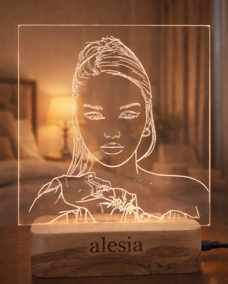 Kjo llampë Line Art krijohet duke transformuar fotografinë tuaj në një dizajn minimalist dhe elegant me vijë të pastër. Çdo portret përpunohet me kujdes për të ruajtur karakterin dhe emocionin, duke u shndërruar në një vepër moderne arti që ndriçon ambientin me një dritë të ngrohtë dhe të butë. Procesi përfshin përgatitje të detajuar të dizajnit, gravim/laser preciz për vijat e pastra dhe përfundim të kujdesshëm për një rezultat estetik dhe profesional.